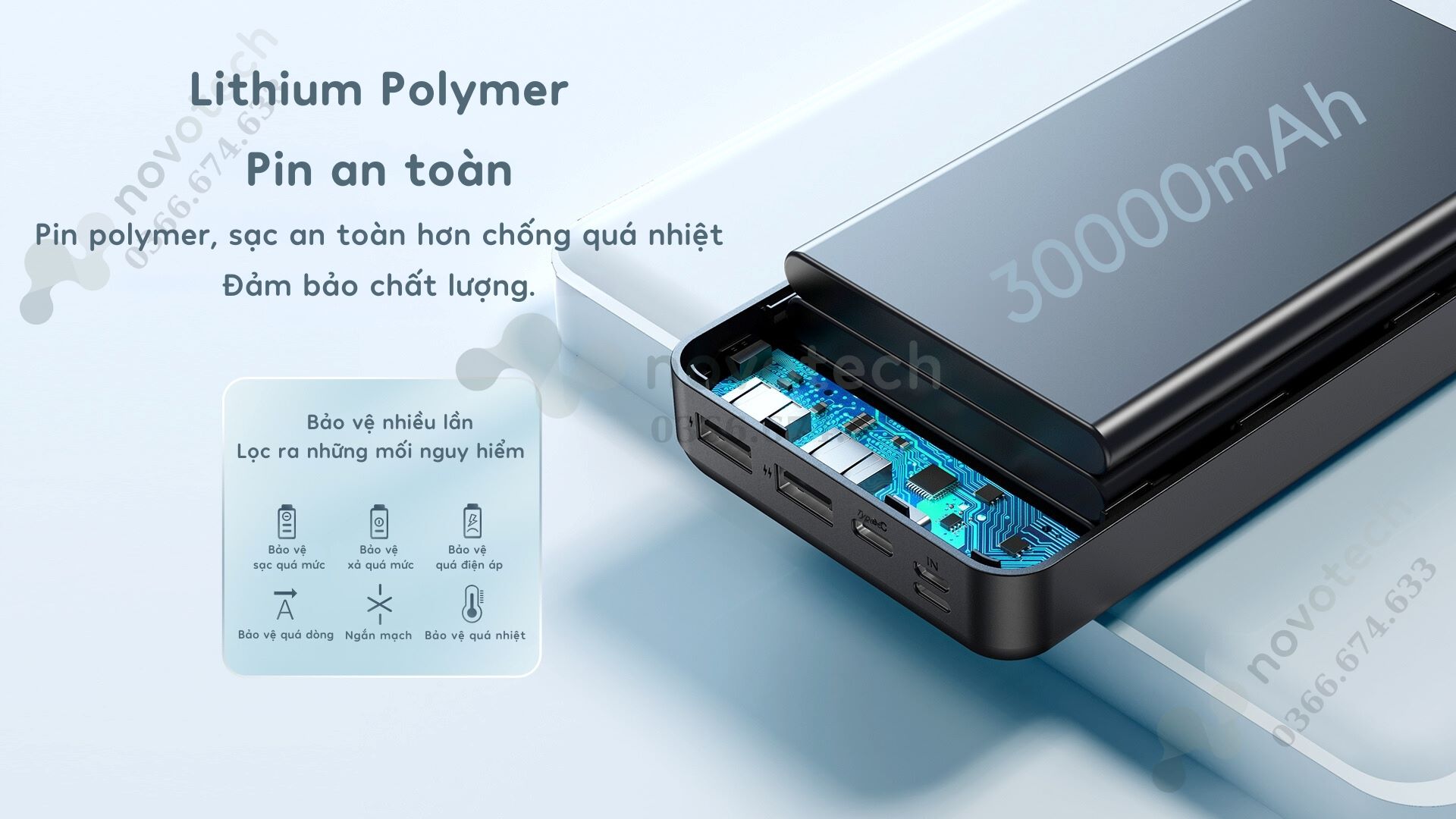 Sản phẩm được trang bị các tính năng bảo vệ an toàn như chống quá nhiệt, chống quá tải, chống ngắn mạch và tự động ngắt khi sạc đầy. Điều này không chỉ đảm bảo an toàn cho thiết bị của bạn mà còn kéo dài tuổi thọ của pin sạc dự phòng.