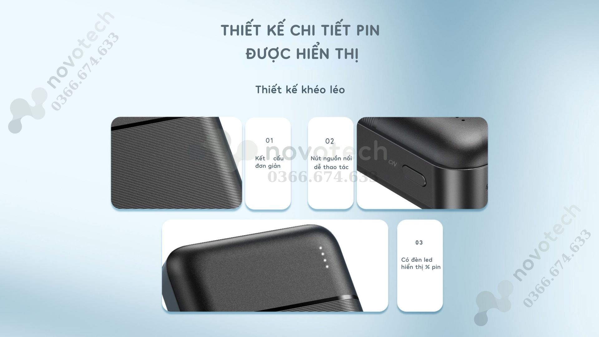 Sản phẩm có thiết kế nhỏ gọn, dễ dàng mang theo bên mình. Vỏ ngoài được làm từ chất liệu cao cấp, chống trầy xước và va đập tốt, mang lại vẻ ngoài sang trọng và bền bỉ. Màn hình LED hiển thị dung lượng pin còn lại giúp bạn dễ dàng theo dõi và quản lý việc sạc pin.