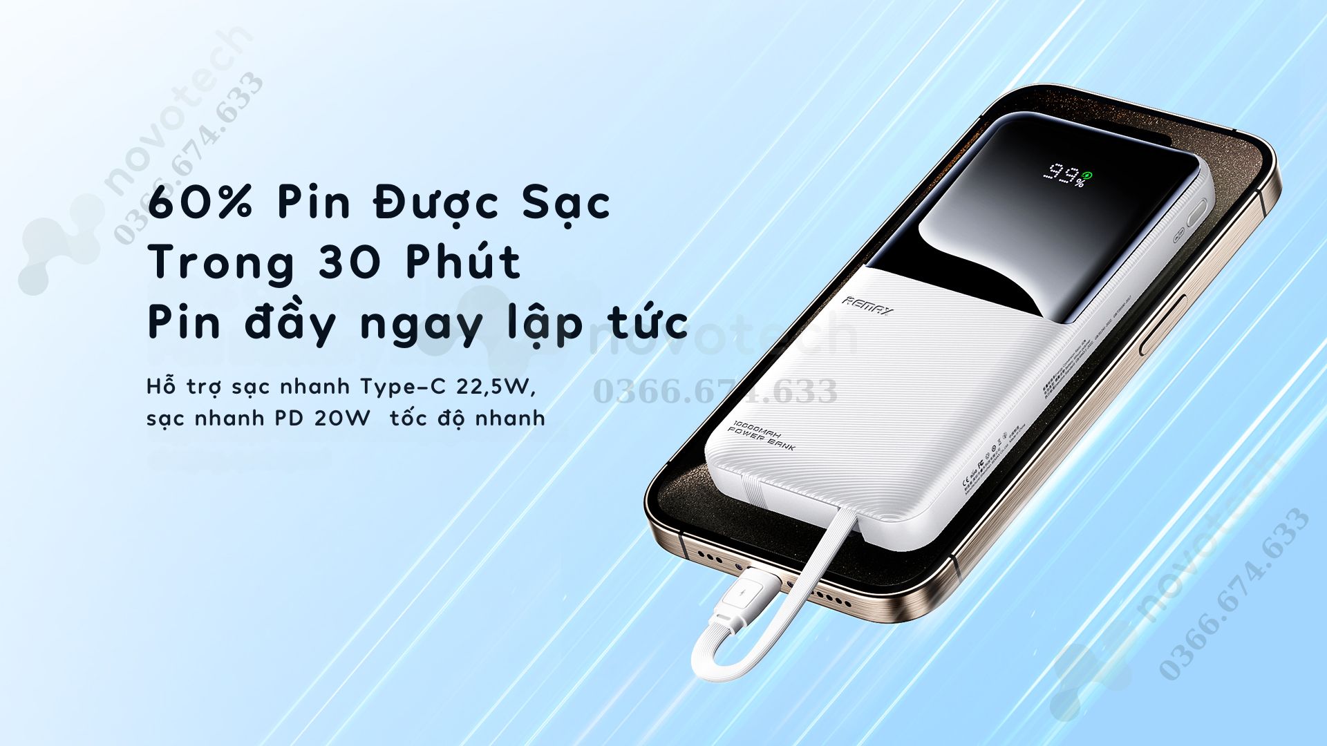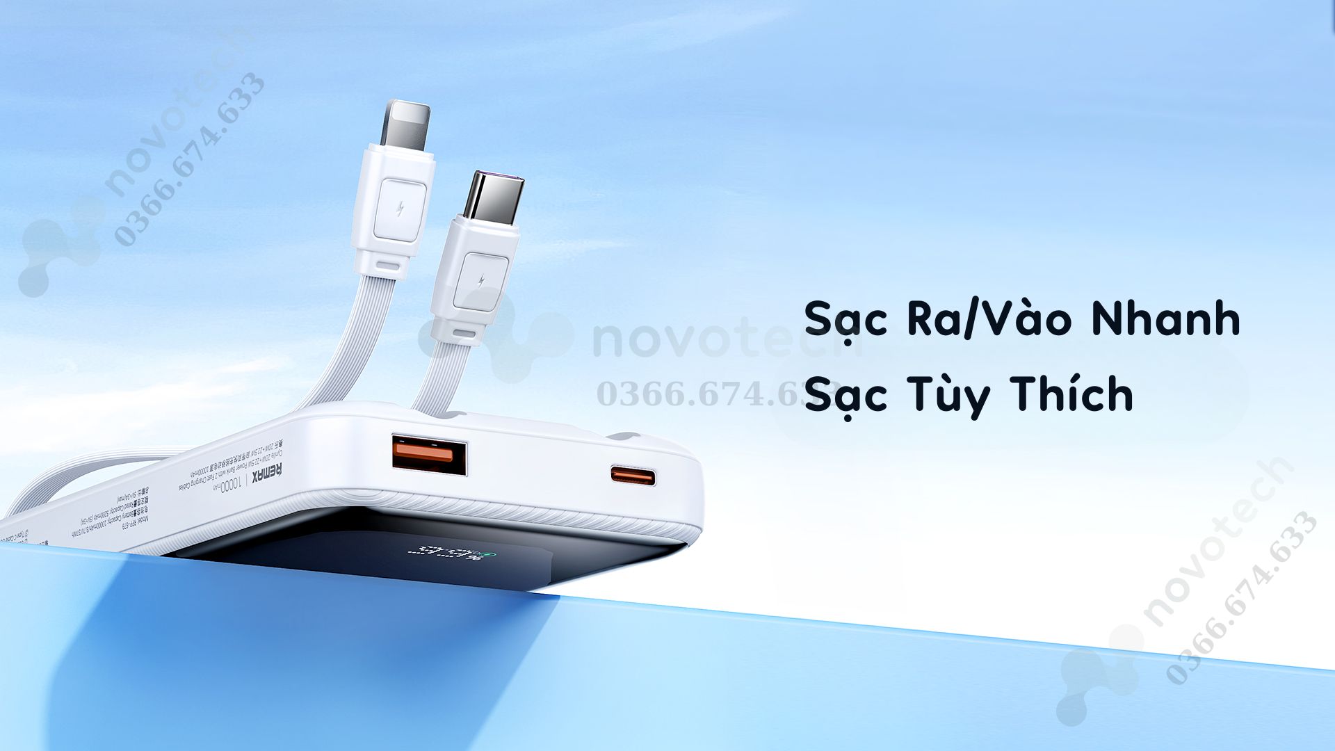 Remax RPP-679 được trang bị hai cổng cáp sạc Type C và Lightning với công suất 22,5W cho phép sạc cùng lúc hai thiết bị mà không ảnh hưởng đến tốc độ sạc. Công nghệ sạc thông minh tự động điều chỉnh dòng điện phù hợp, bảo vệ pin và kéo dài tuổi thọ cho thiết bị.