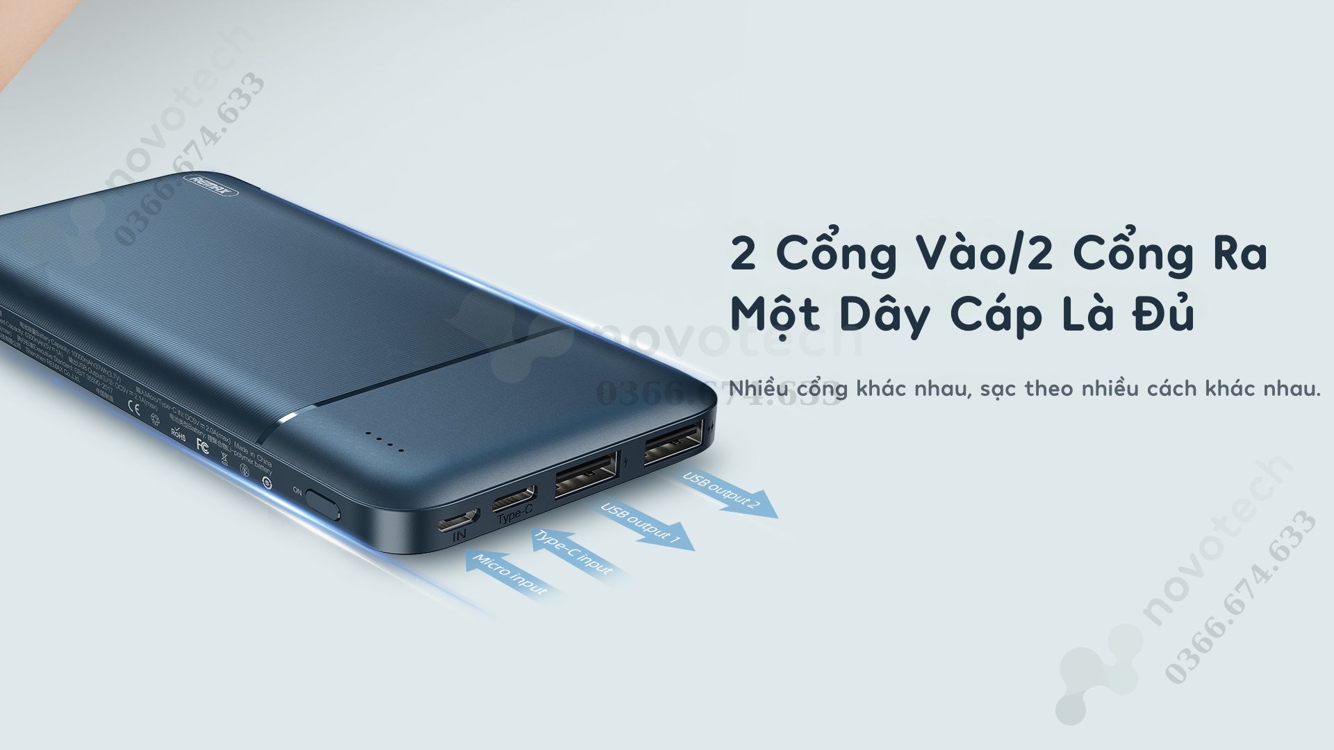 Pin dự phòng Remax được thiết kế 2 cổng vào, 2 cổng ra giúp bạn dễ dàng sử dụng với đa dạng cổng kết nối.